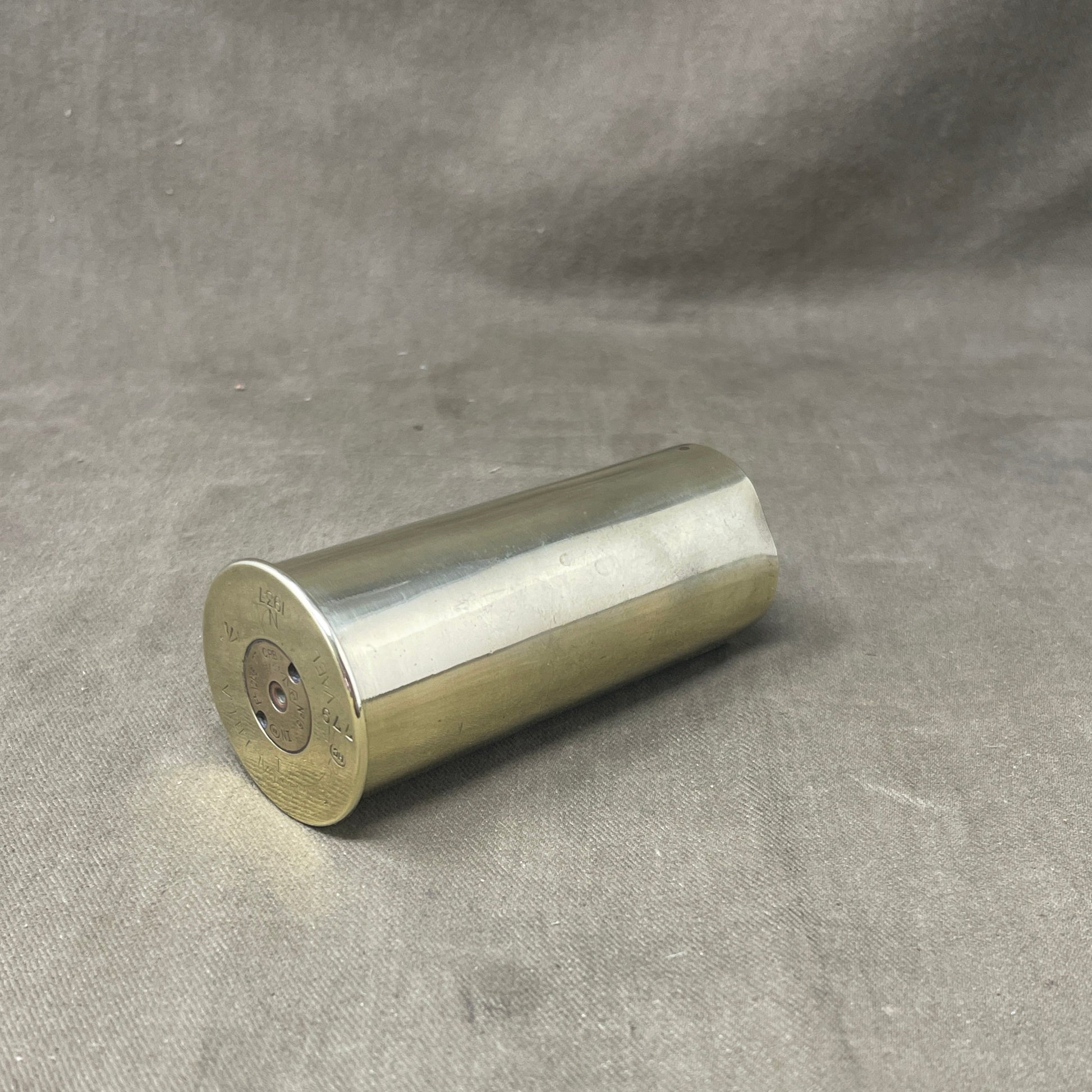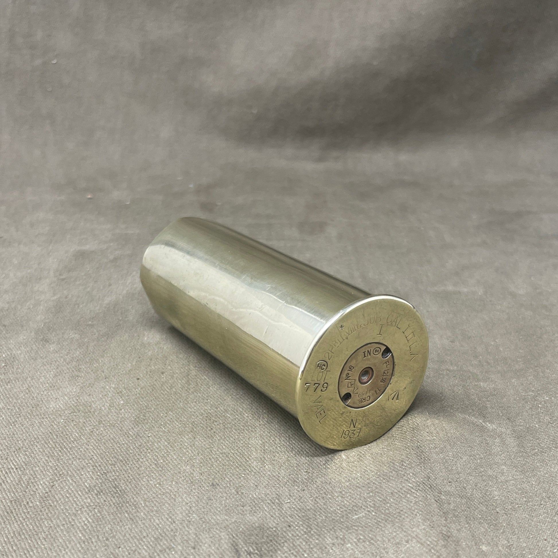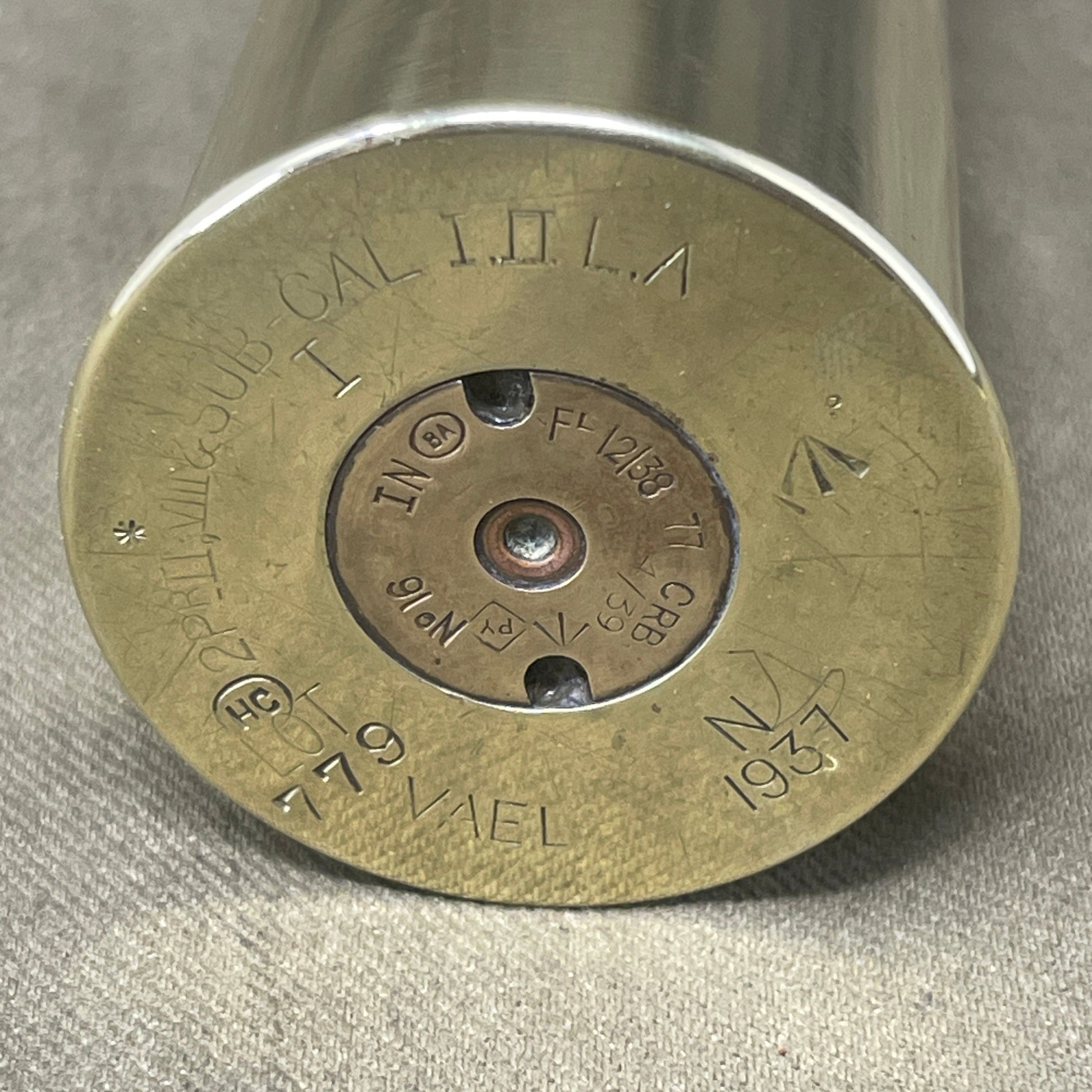 In excellent condition, dated 1937 with a British broad arrow stamp on the base. The “2 pr II” and “VIII” refer to the most common versions of the gun in RN service. The “Sub-Cal” means that it is used in sub-calibre training systems (the gun being attached to, or mounted within, larger guns). The LA refers to low angle training systems (the high-angle case was shorter).