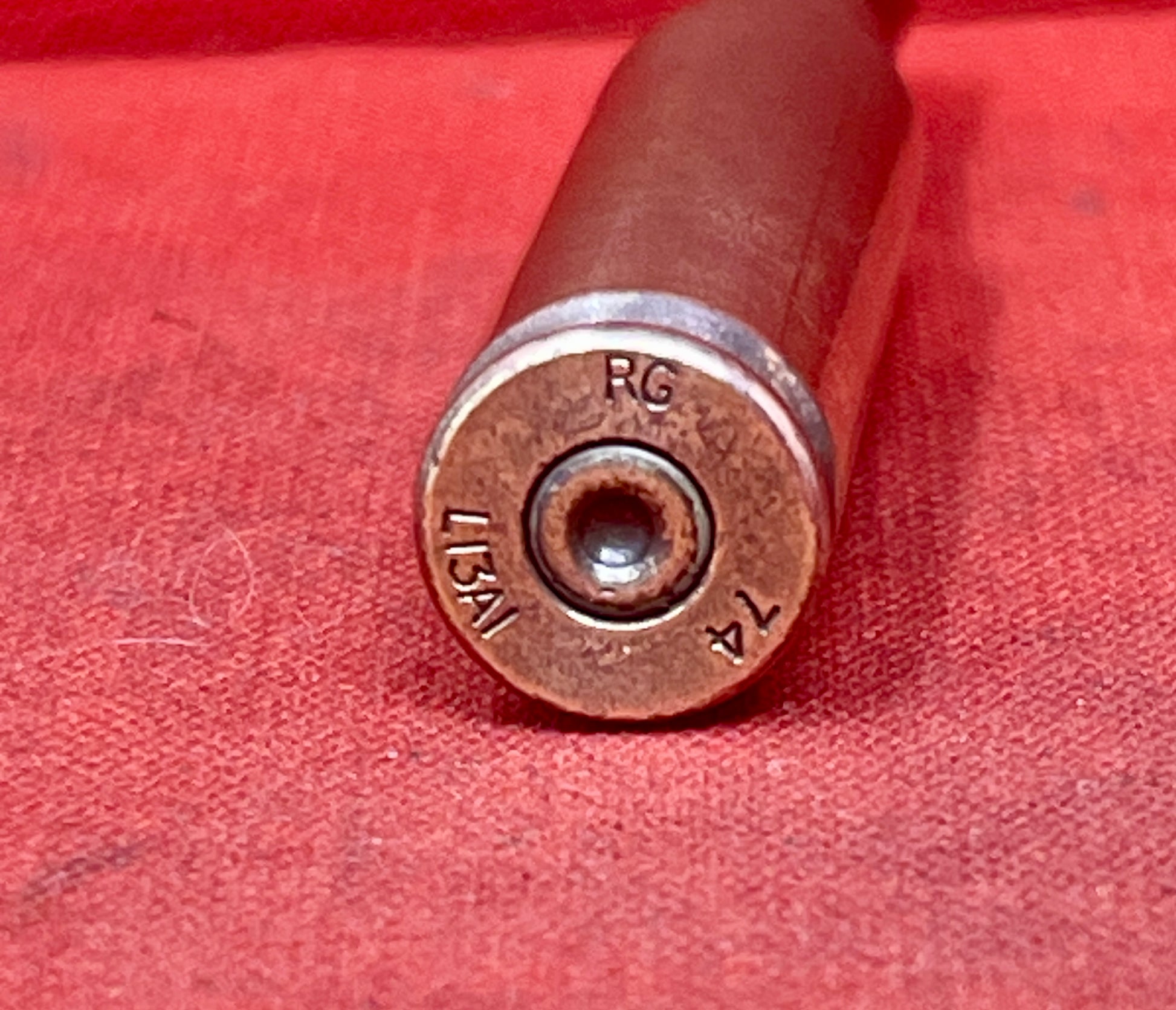 The cartridge has been fired and is fully inert, containing no live primer or propellant, making it safe for collectors, display, or reference purposes. The headstamp clearly shows RG manufacture and 1974 dating, placing it firmly within the period of British service use alongside the L1A1 SLR and later 7.62mm NATO platforms.